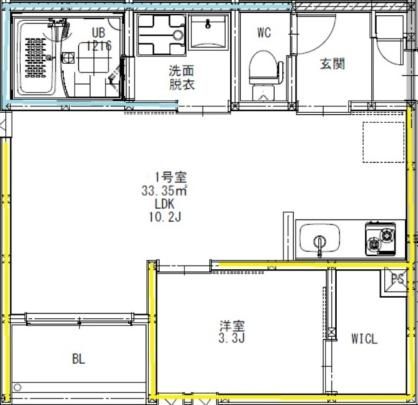 | 築年月 | 新築 | 間取り | 1LDK( LDK10.2畳/洋室3.3畳 ) | 専有面積 | 33.35m2 |