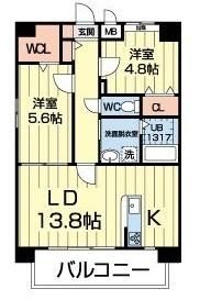 | 築年月 | 2019年2月 | 間取り | 2LDK( LDK13.8畳/洋室4.8畳/洋室5.6畳 ) | 専有面積 | 60.12m2 |