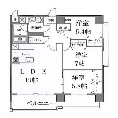 | 築年月 | 2013年3月 | 間取り | 3LDK( LDK19畳/洋室4.6畳/洋室5.8畳/洋室7畳/洋室5.4畳 ) | 専有面積 | 85m2 |